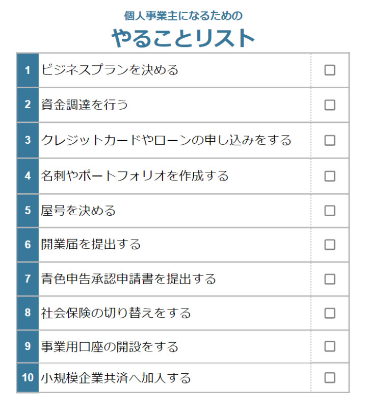 個人事業主とは、独立して継続的な事業を行う人を指します。個人事業主になるには何から始めればいいのか、やるべきことをリストにまとめました。