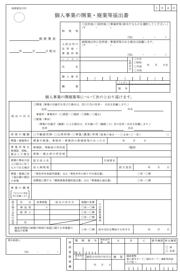引用元 : 個人事業の開業・廃業等届出書|国税庁