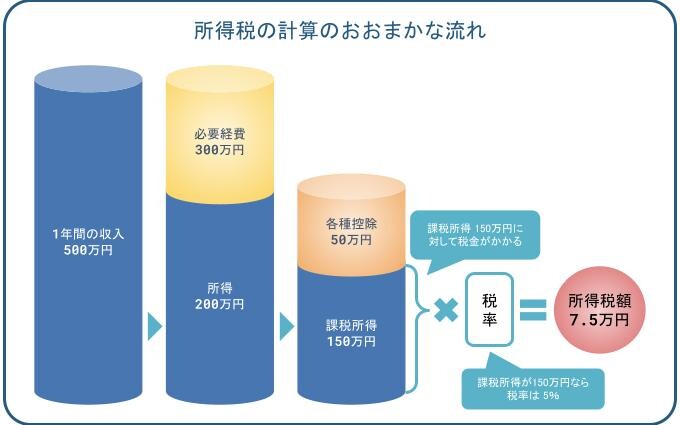 経費計上が重要な一番の理由は、確定申告で所得税の税率や総額が変わることです。確定申告では一年分の収支を計算し、収入から必要経費や各種控除を引いた課税所得に税金がかかります。